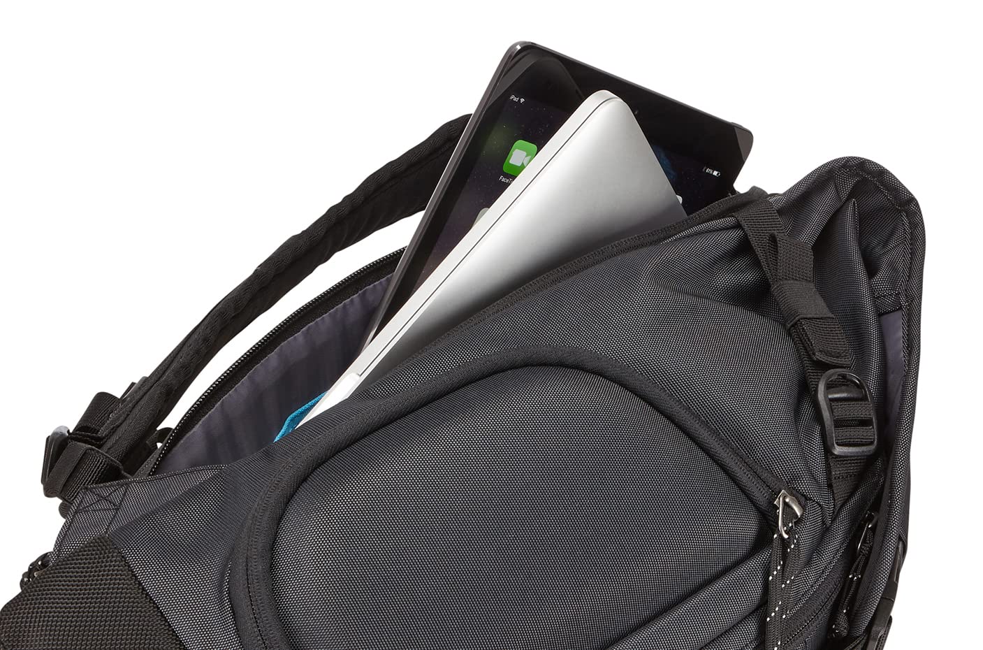 Compartimento SafeZone: Incluye un bolsillo rígido, termolaminado e indeformable (ubicado en la parte superior o lateral según versión) para proteger gafas de sol, iPhone u otros objetos frágiles. Nota: En este modelo, la estructura rígida interna suele ser extraíble para ganar espacio si se requiere.